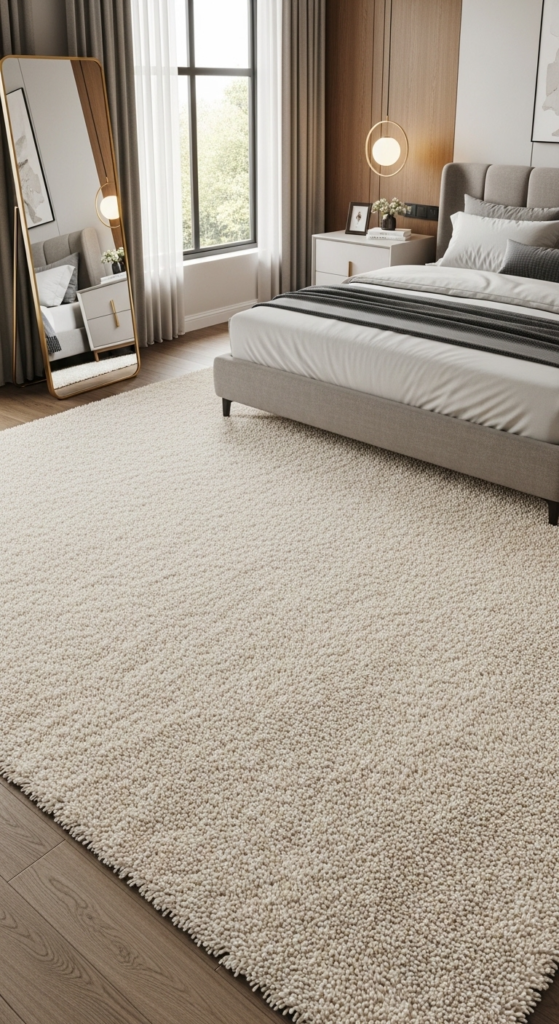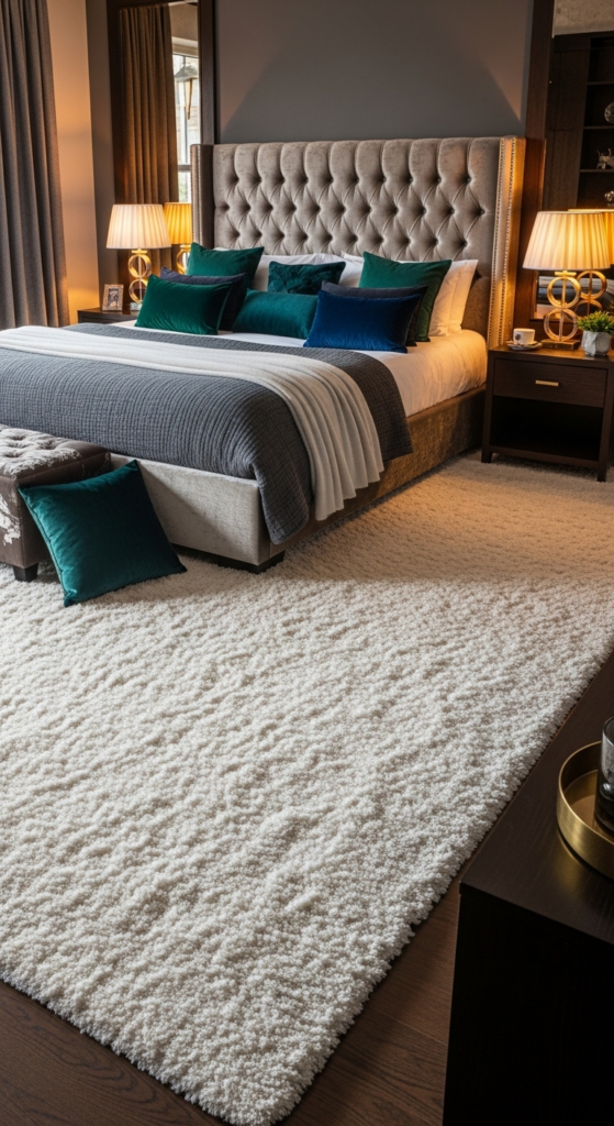 If cozy is your goal, a shag rug is your best friend. The soft, fluffy texture makes your bedroom feel warm and inviting.