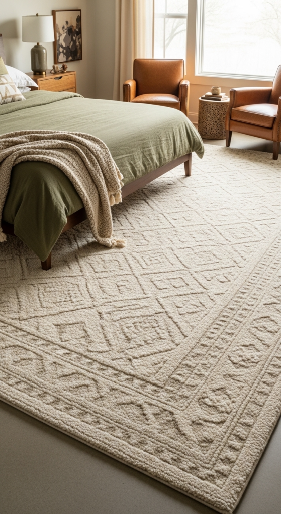One of the easiest ways to elevate your bedroom is by choosing a large rug. Instead of a small piece that floats awkwardly, go for a rug that sits under most of your bed and extends outward.