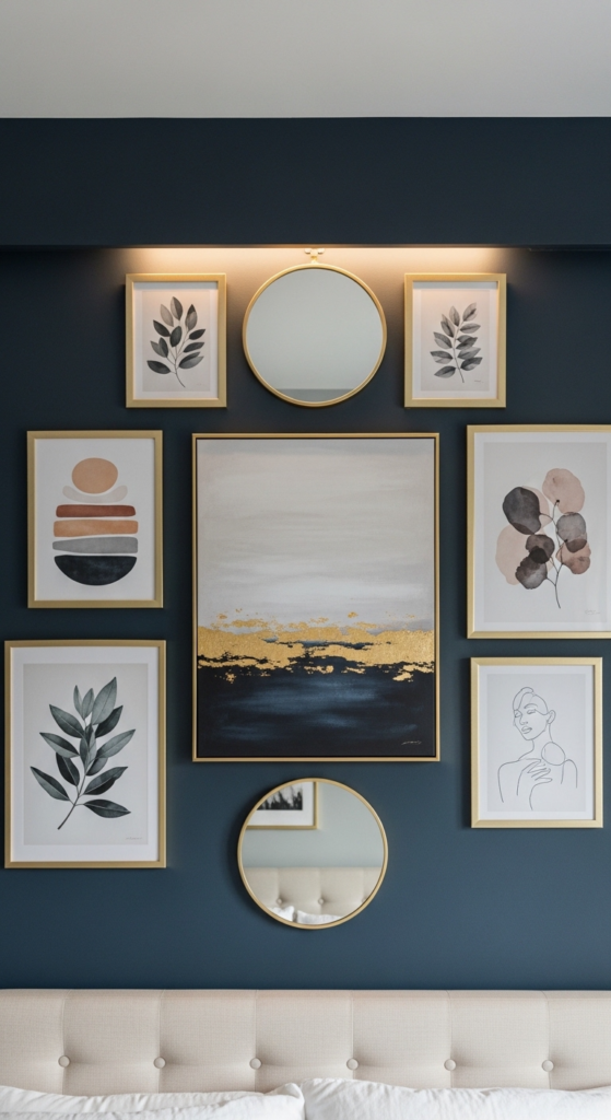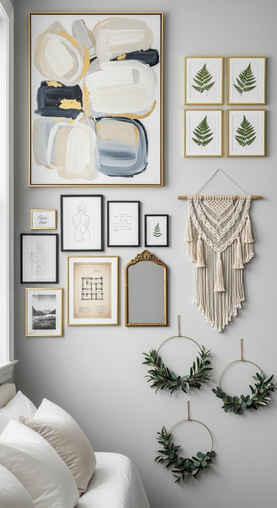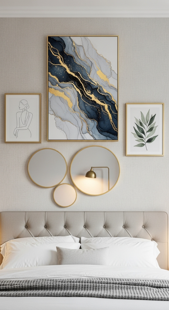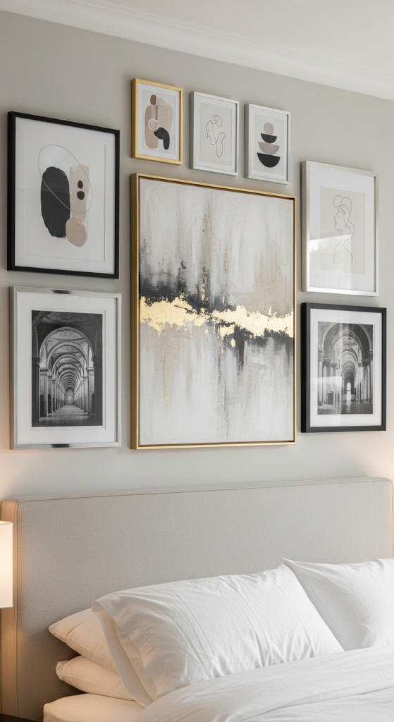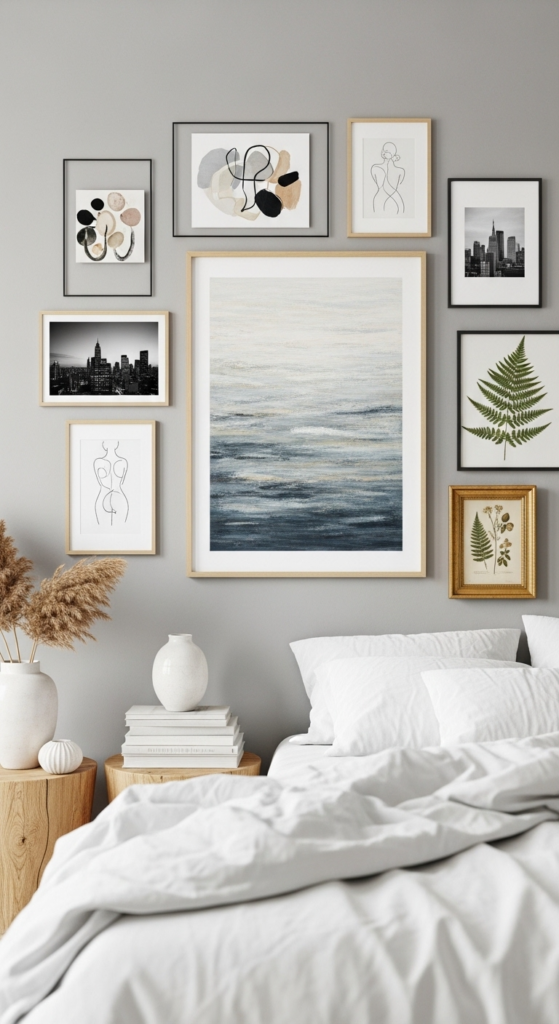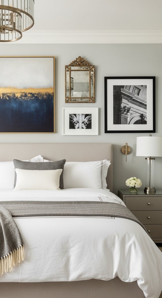 A gallery wall is one of the easiest ways to make your bedroom feel curated and expensive. Mix framed prints, photos, and even small art pieces you love.