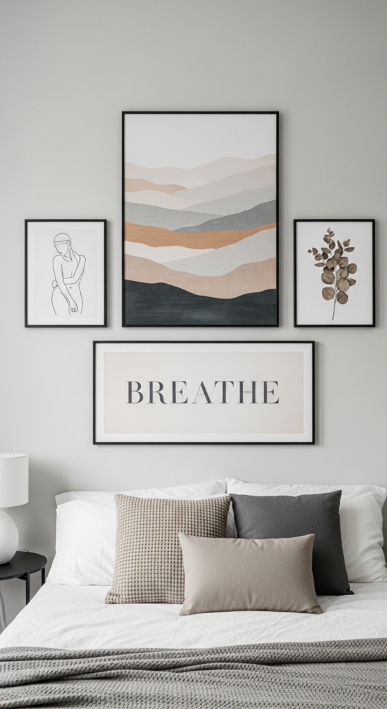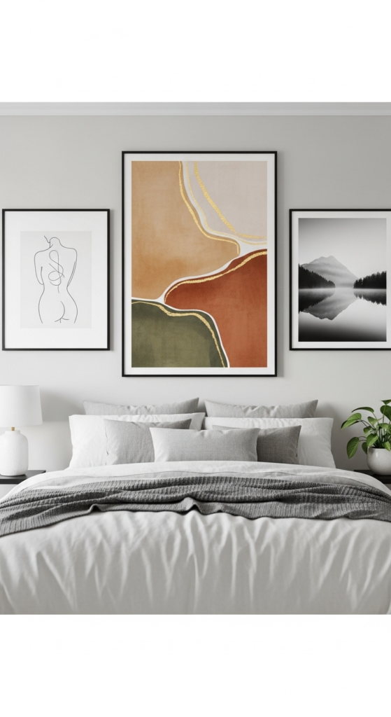 Hang two or three matching frames evenly spaced above your bed. This simple trick makes your room feel calm and organized.