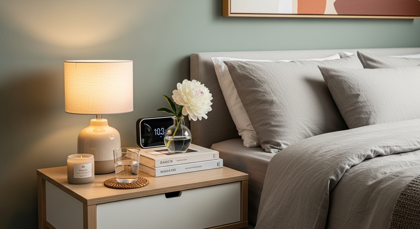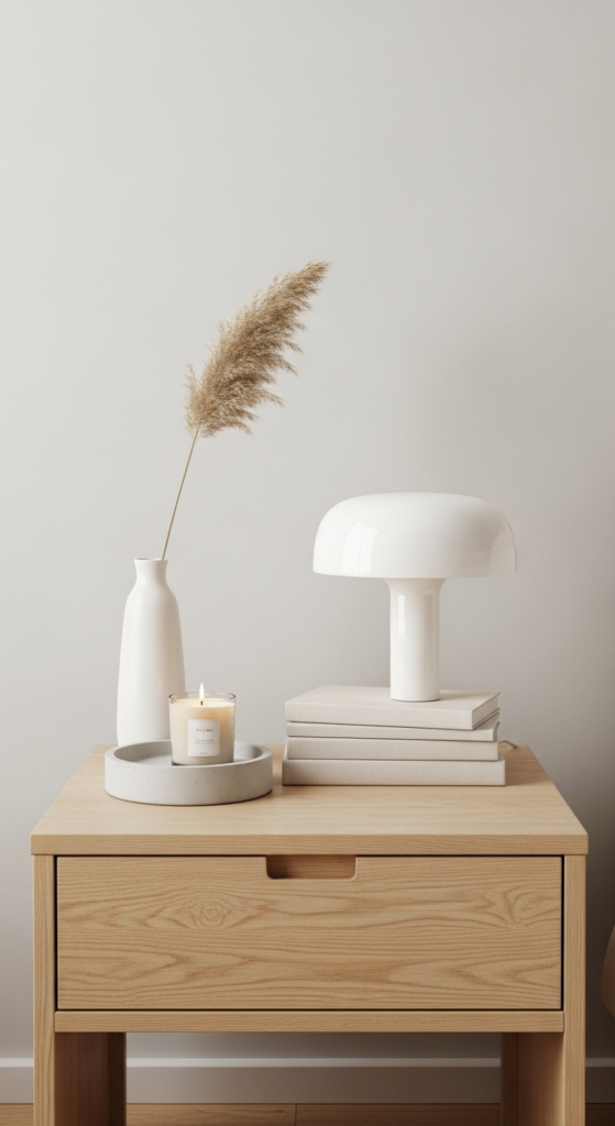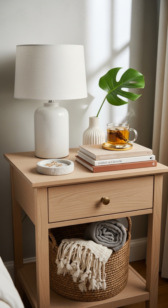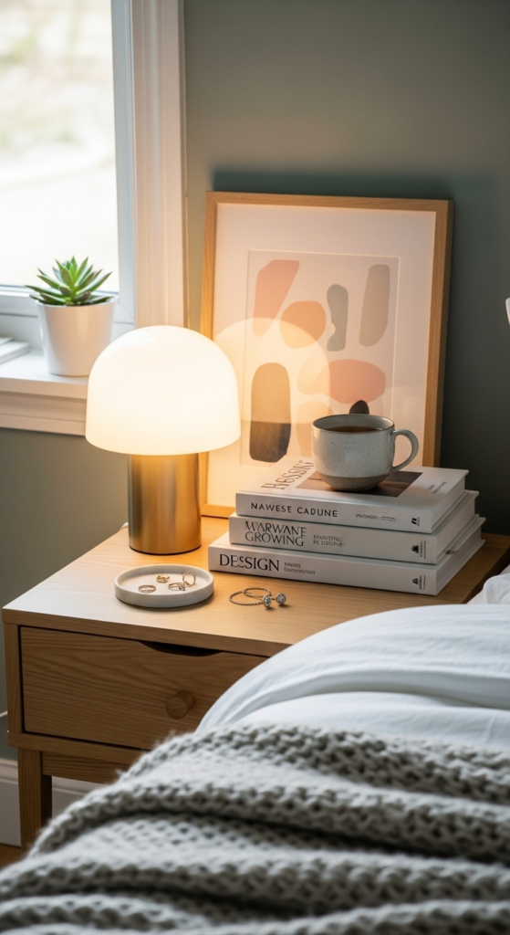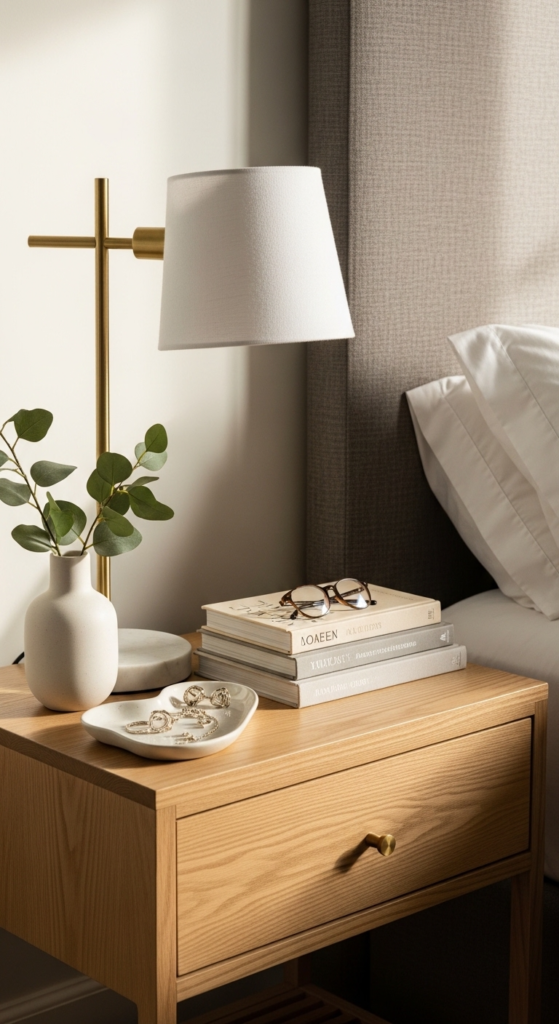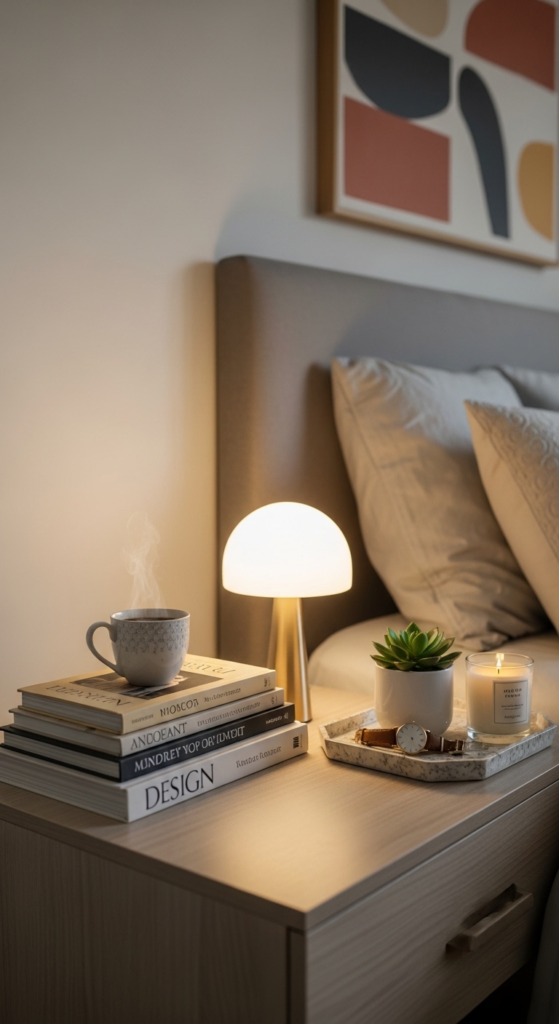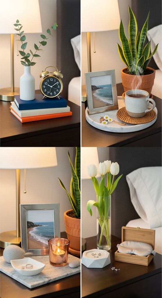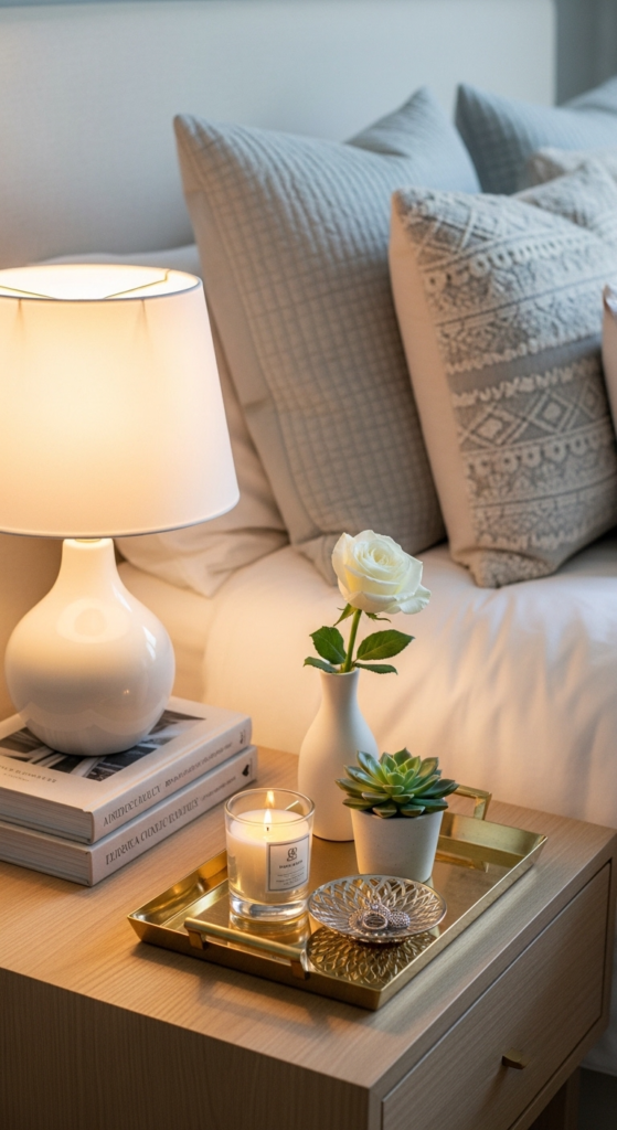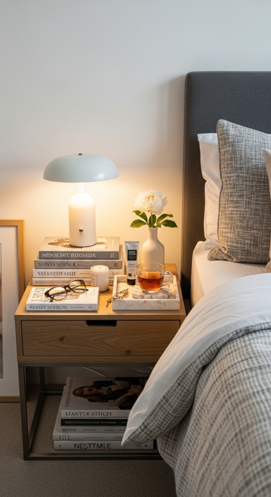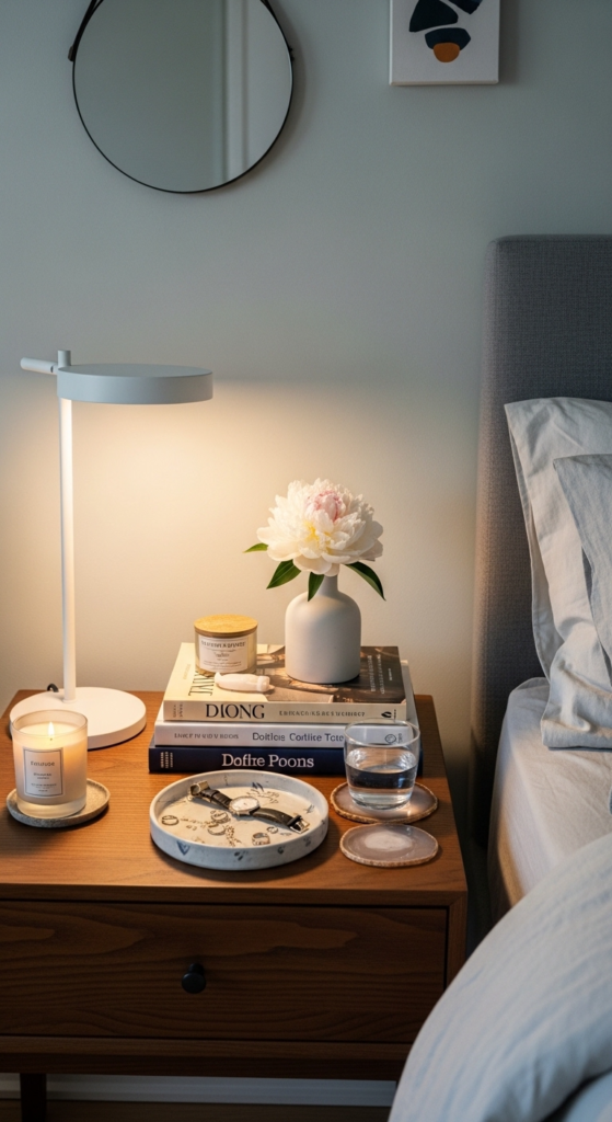 Mix tall (lamp), medium (books or plant), and small (tray or candle) items. This creates visual interest and makes your bedside table decor ideas look more intentional.