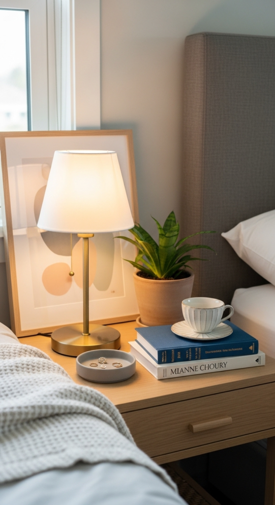 A good lamp is the anchor of your bedside table. It adds height, balance, and soft lighting that makes your room feel cozy at night.