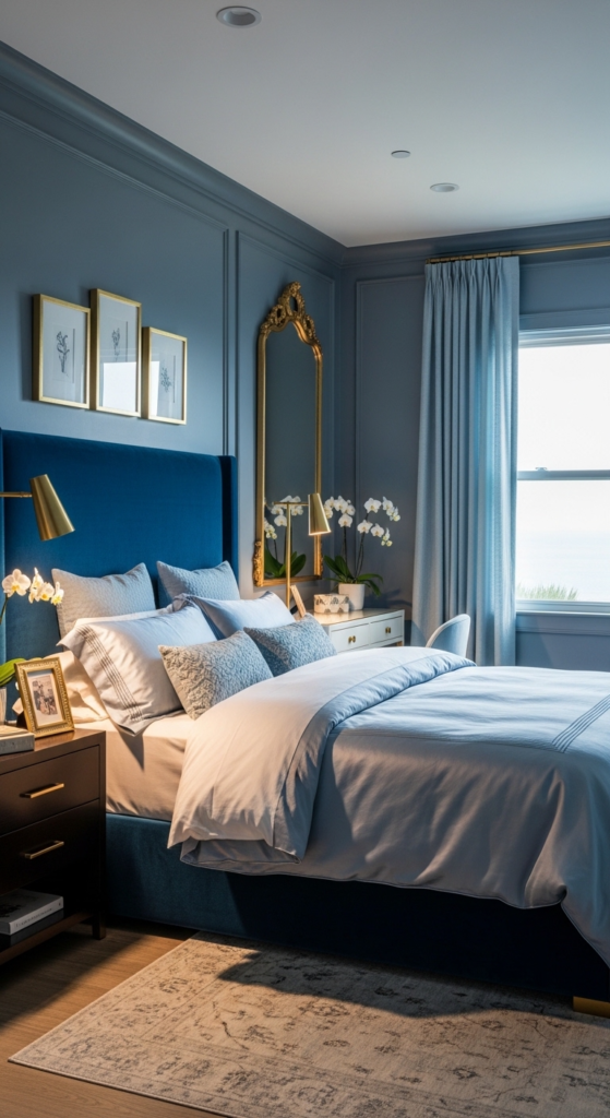 Think bedside lamps, picture frames, or drawer handles. The warm tones of gold balance out the coolness of blue and make the whole space feel more elevated.