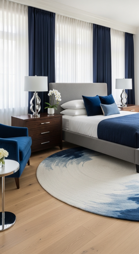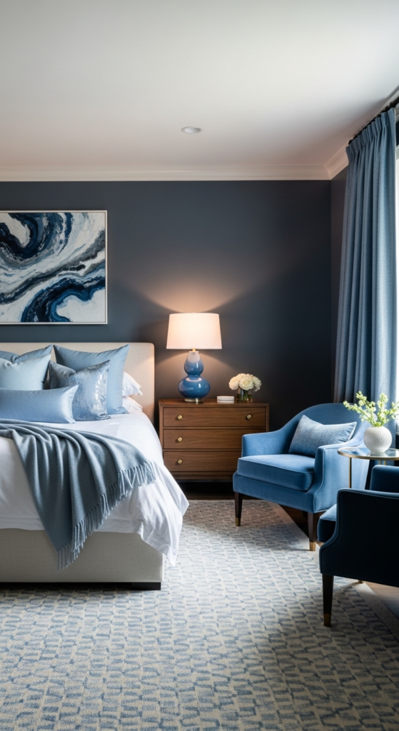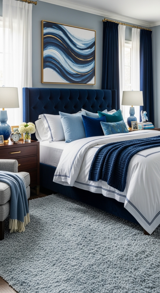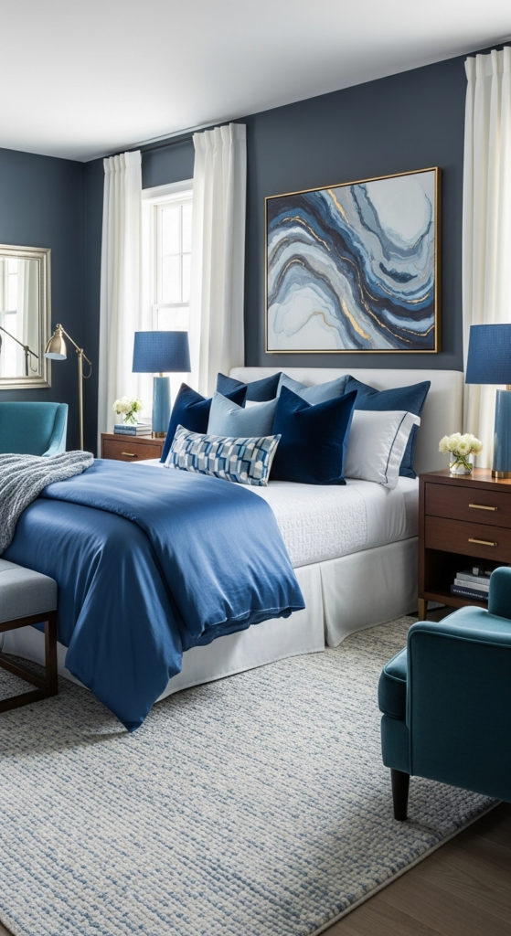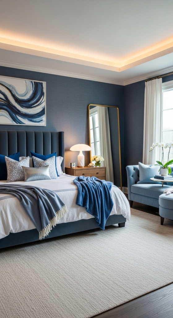 If you love bold decor, a navy accent wall can completely transform your space. It creates depth and makes your bed the focal point.