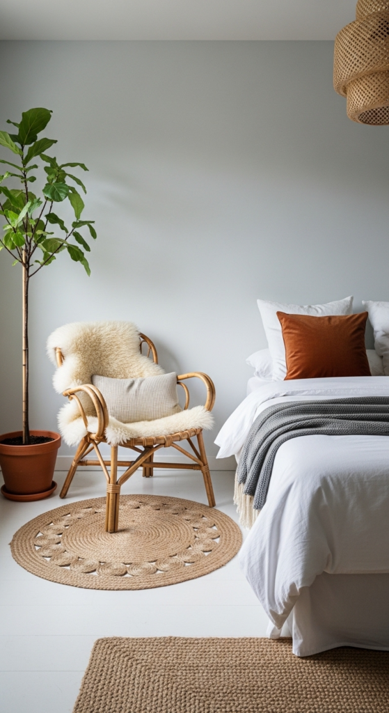 Try a rattan chair, a wooden nightstand, or a jute rug. Even small accents like baskets or trays can make your space feel warmer and more organic.