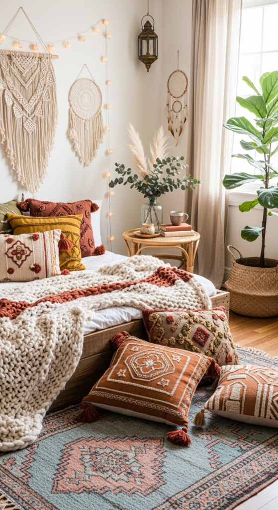 Boho style is all about layers. Start with soft, neutral bedding, then add texture with throw blankets, quilts, or a chunky knit.