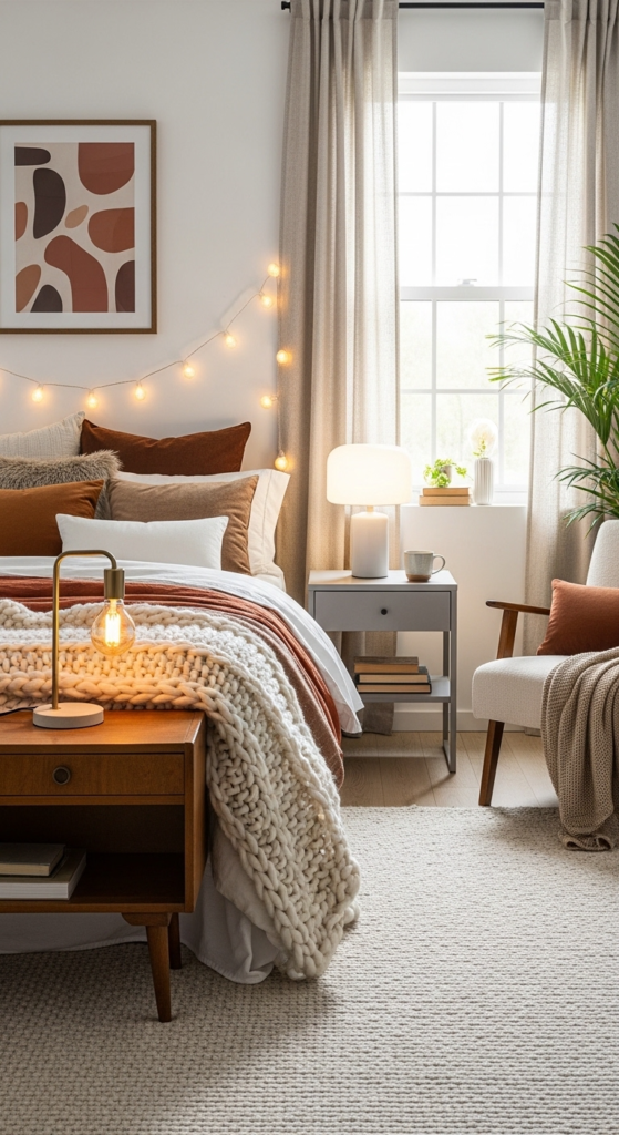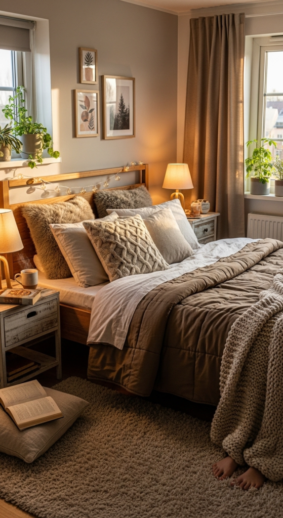 You don’t need expensive pieces. Mix different fabrics like cotton, knit, and faux fur to create depth. The more layers, the more inviting your bed will feel.