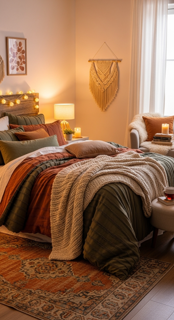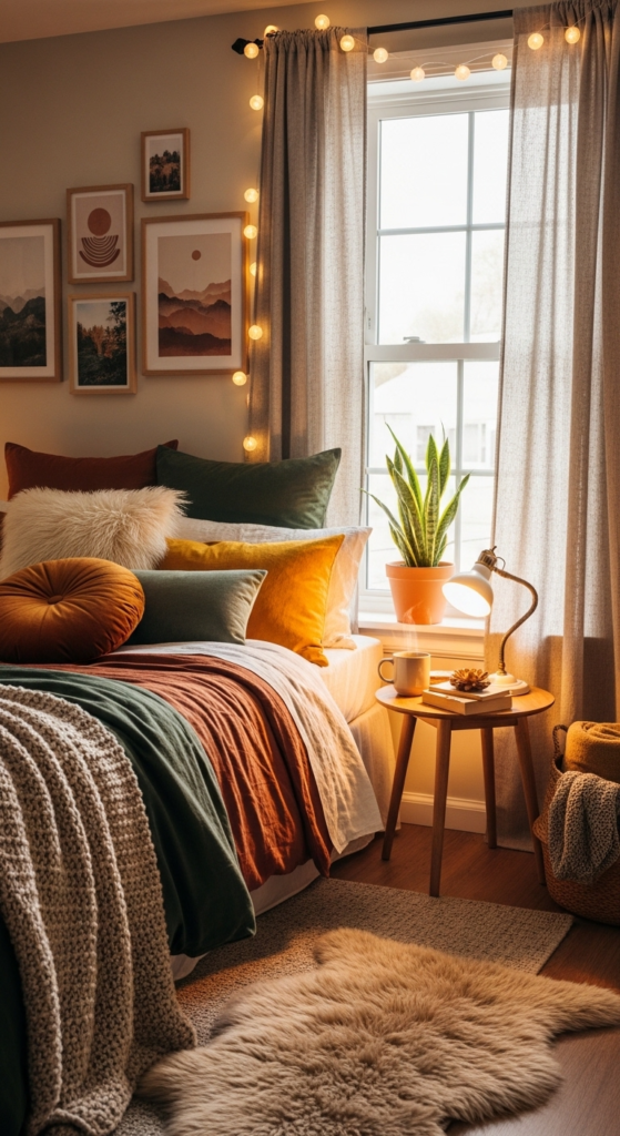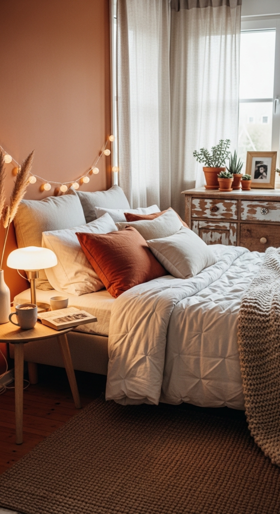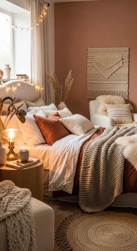 You don’t have to repaint your entire room. Start small with bedding, curtains, or decor pieces in these shades to bring in that cozy aesthetic.