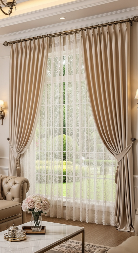 This setup gives you full control over light and privacy. It’s one of the most practical curtain ideas for living room setups, especially if your space gets a lot of sunlight.