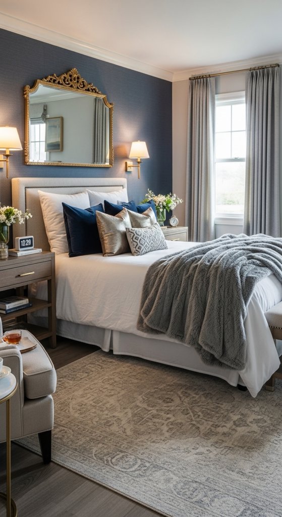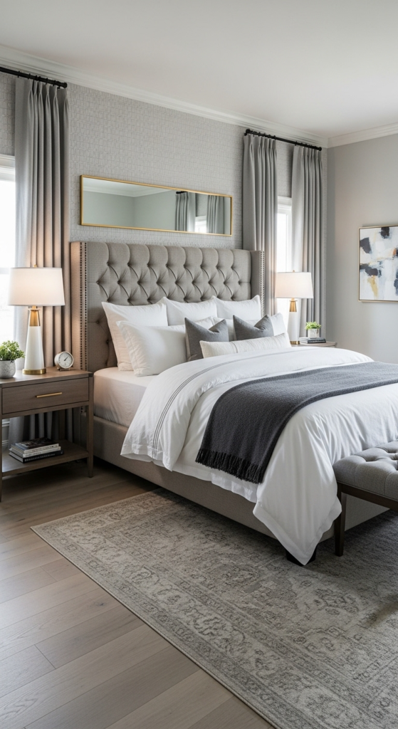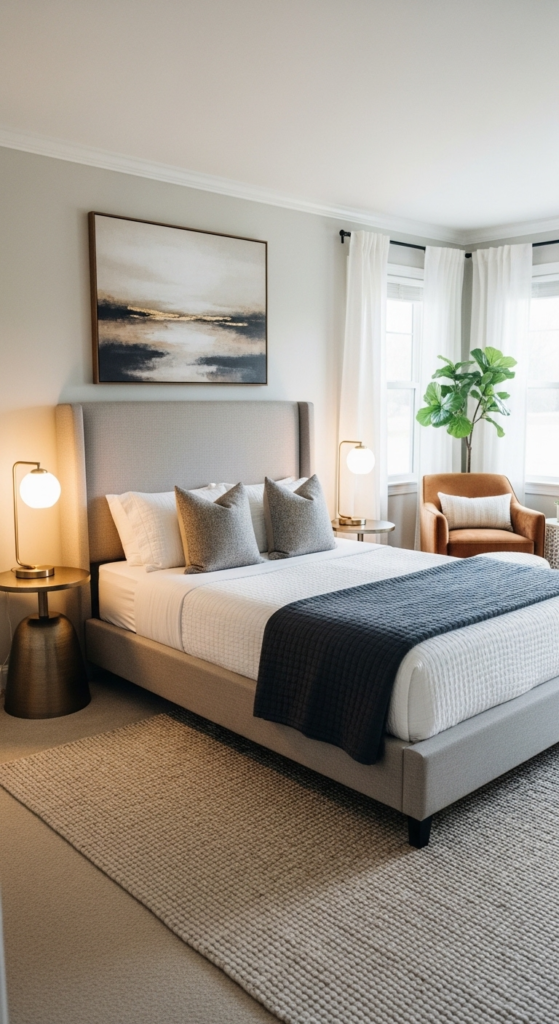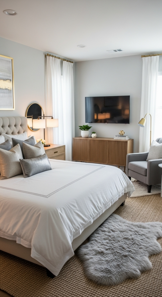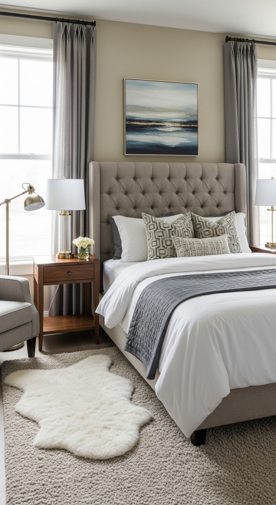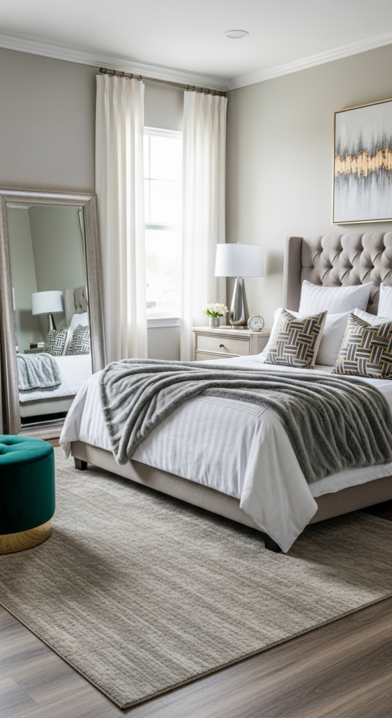 Place a larger neutral rug under your bed, then add a smaller textured rug on top. It adds warmth, dimension, and that designer touch you see in magazine-worthy bedrooms.