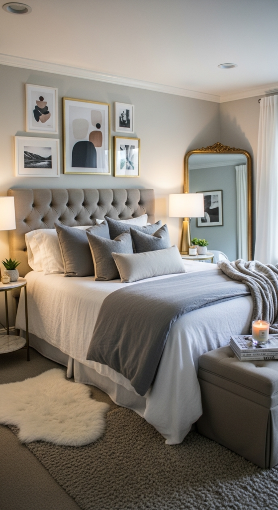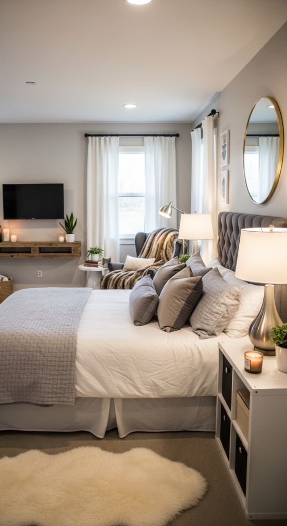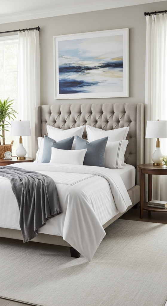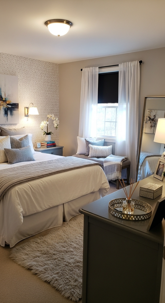 Choose soft, neutral tones like white, beige, or light gray. These instantly make your space feel calm and high-end. Layer your bedding with a comforter, throw blanket, and a few pillows for that dreamy, hotel-like look.