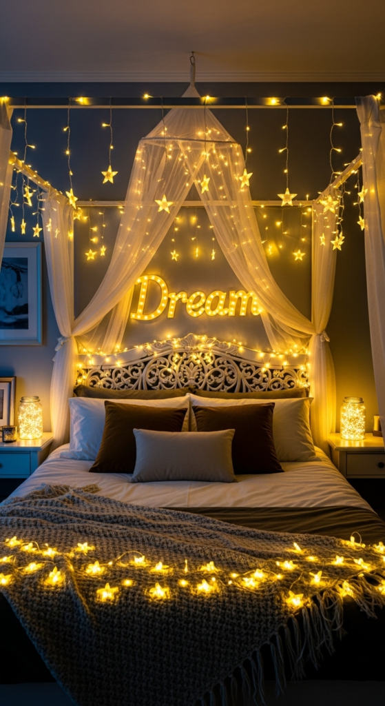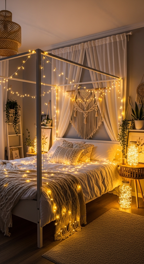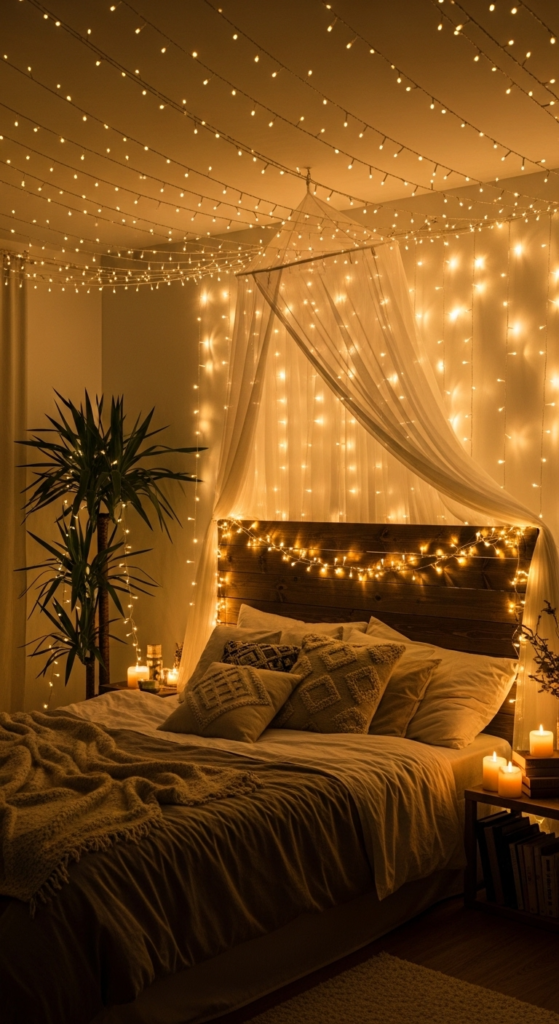 Let’s dive into some of the most beautiful ways you can use fairy lights to upgrade your bedroom.
