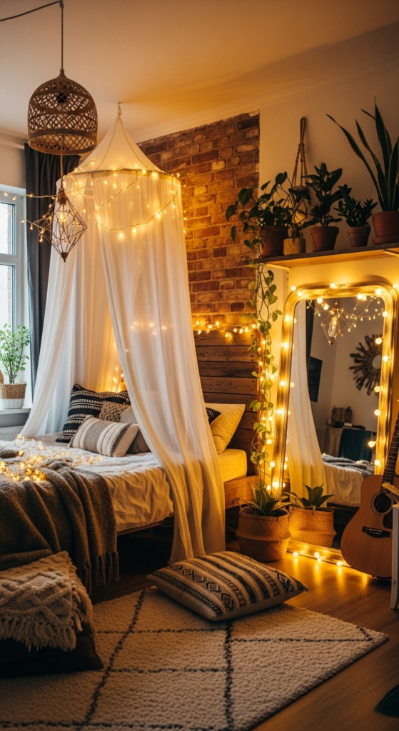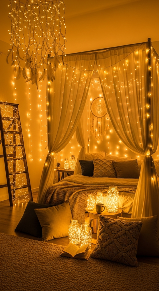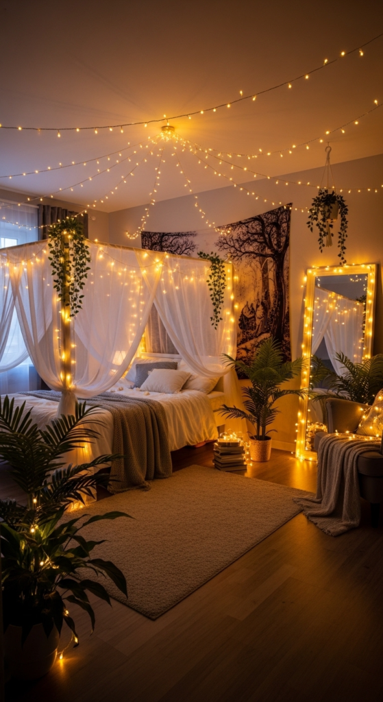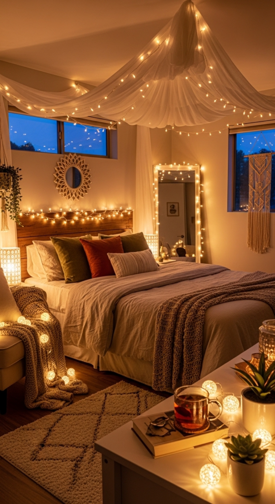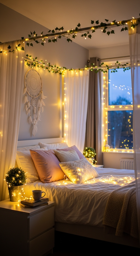 Layering fairy lights behind sheer curtains gives you that Pinterest-perfect glow. It diffuses the light beautifully, making your room feel soft and calming.