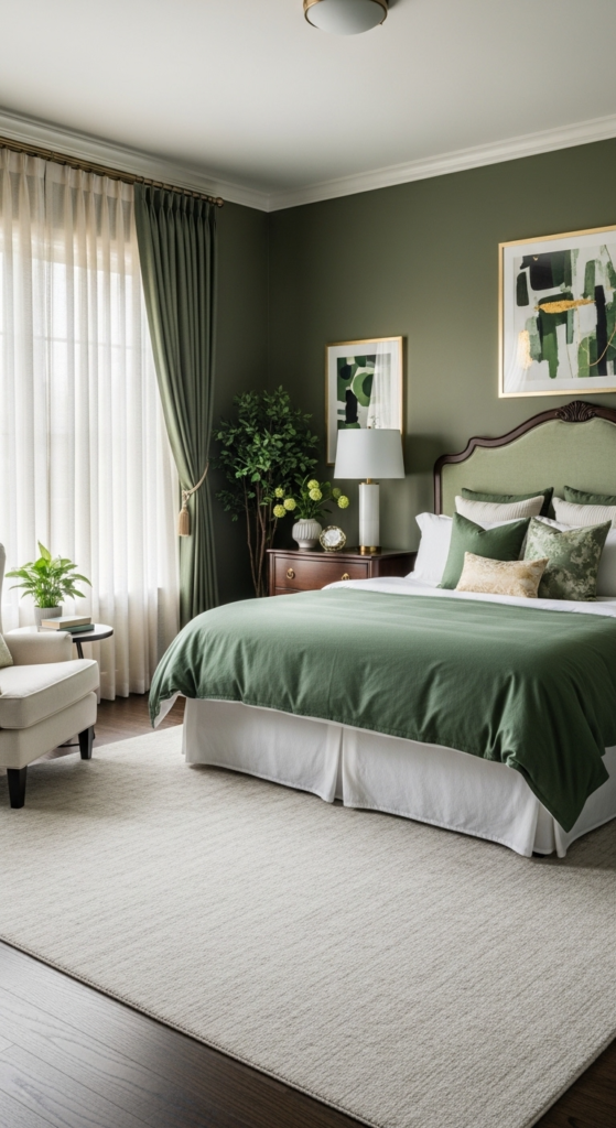 Wall decor is an easy way to enhance your green bedroom aesthetic. Botanical prints, nature photography, or abstract green art all work beautifully.