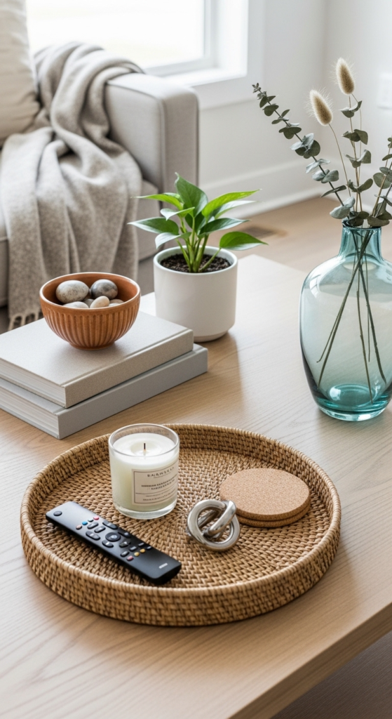 A decorative tray creates structure and keeps items visually grouped. Whether you choose wood, marble, or woven materials, it instantly makes everything feel more organized and styled.