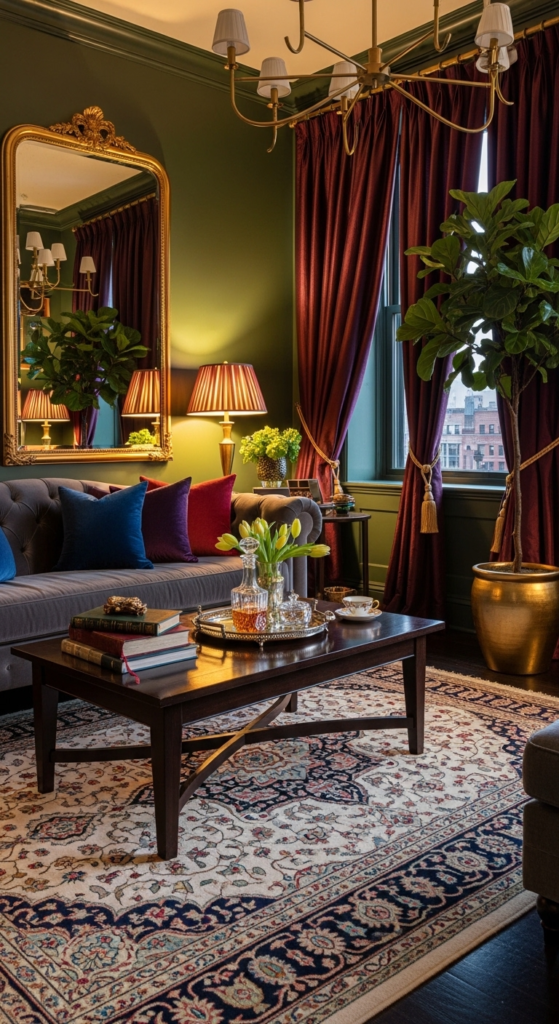 Olive, sage, or moss green walls paired with neutral furniture create a relaxing and grounded atmosphere. Add a few indoor plants to tie everything together.