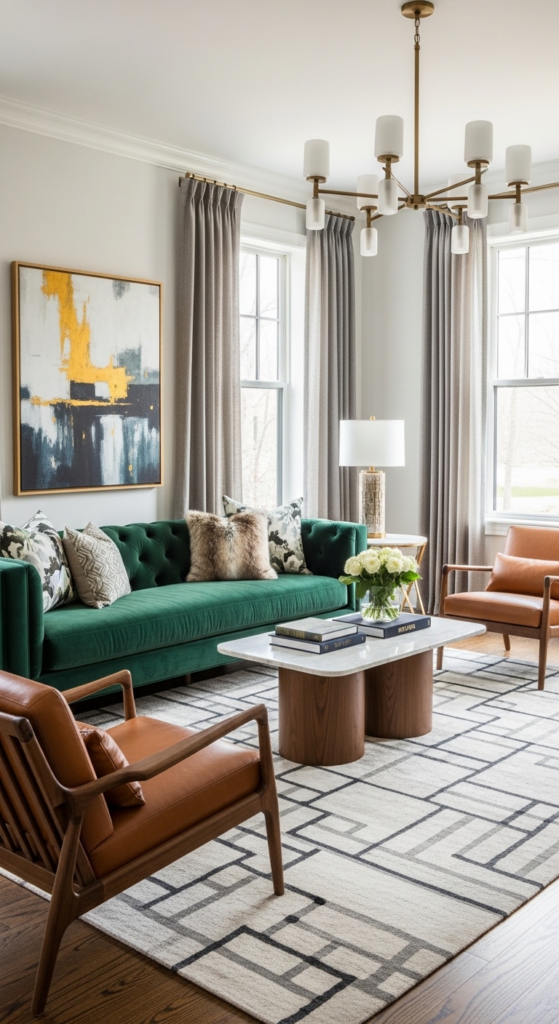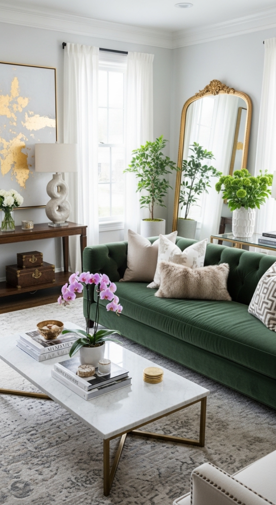 Mix materials like soft throws, woven baskets, velvet cushions, or a chunky knit blanket. Texture adds richness and makes your living room feel cozy and layered—even if your color palette is simple.