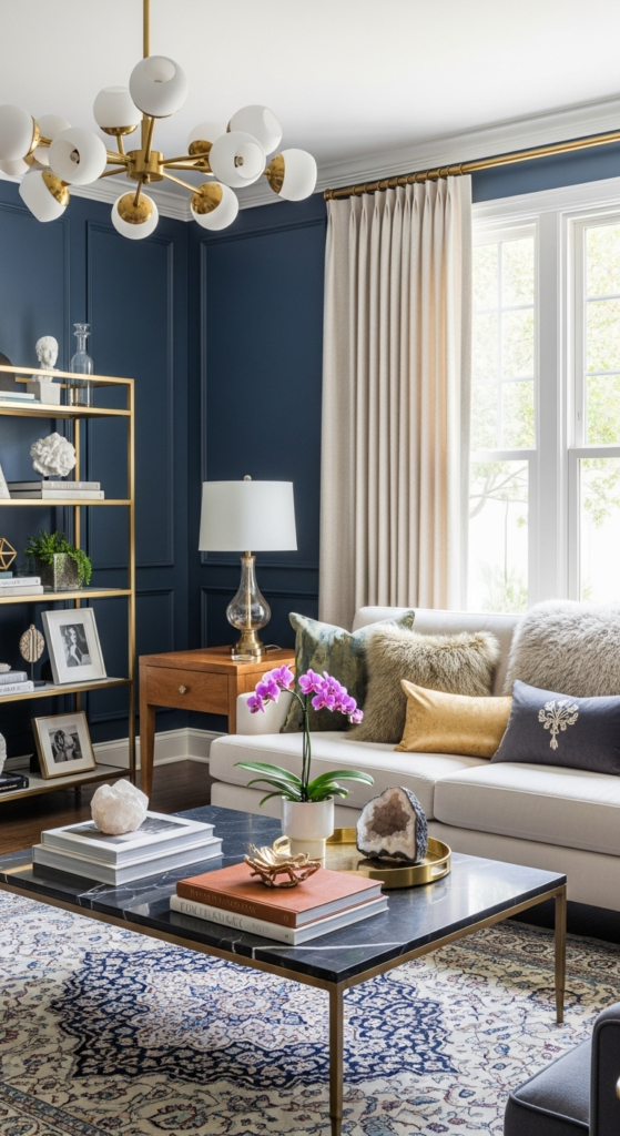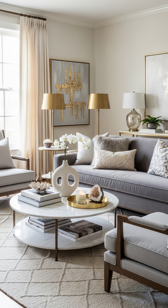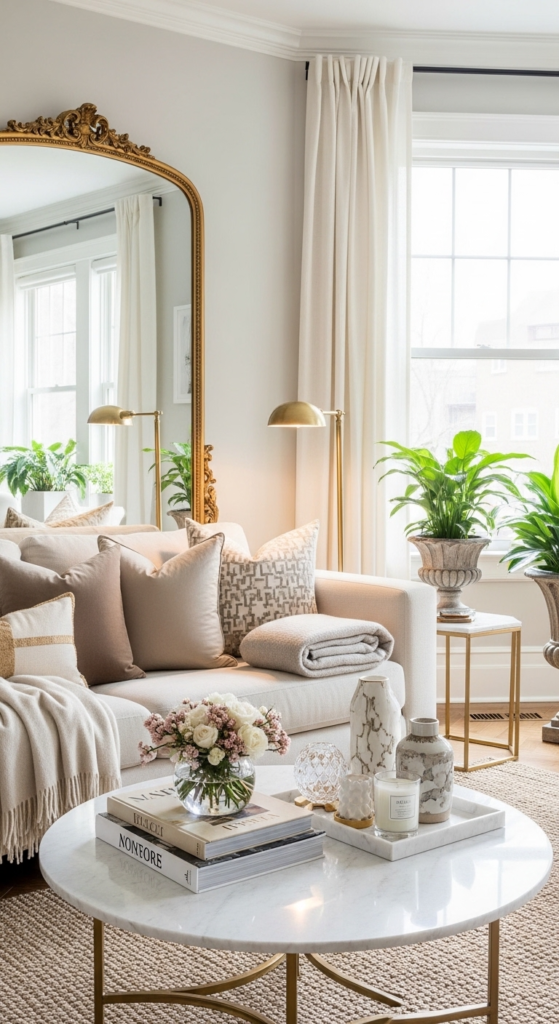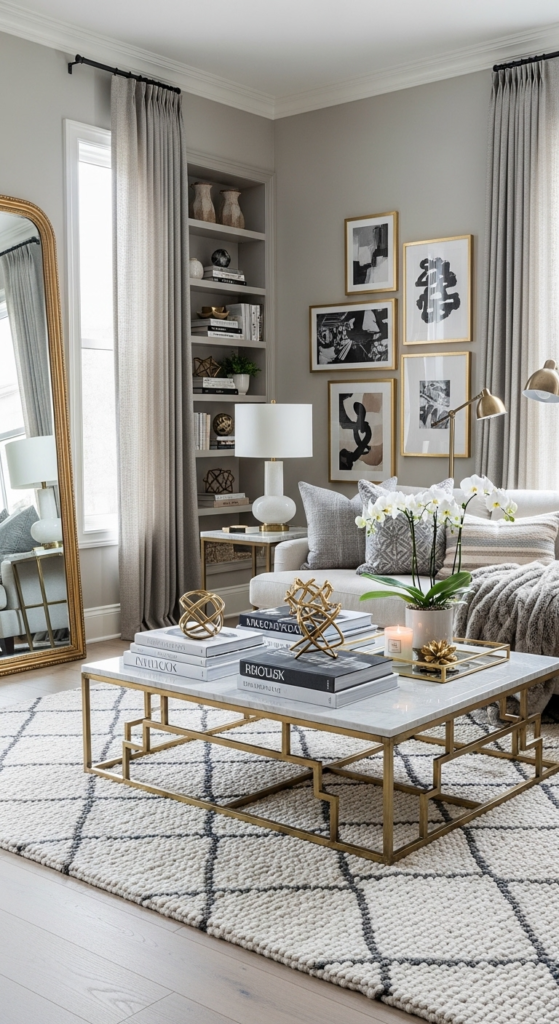 Keep your coffee table and shelves minimal. Leave some empty space so your decor can “breathe.” This instantly makes your living room look more expensive and curated.