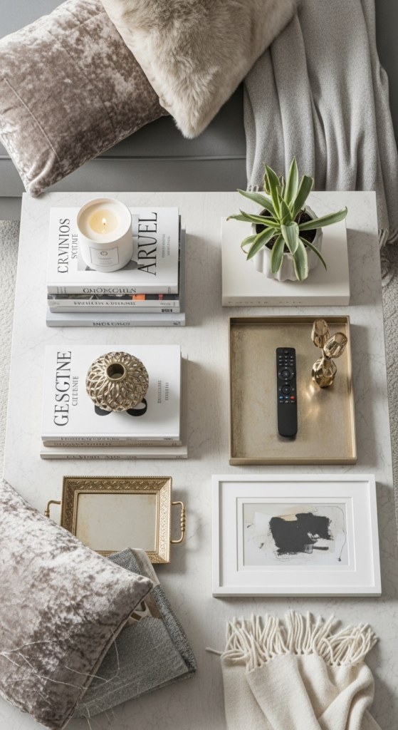 For example, you can pair a candle, a small plant, and a decorative object. Odd numbers feel more natural and visually pleasing, which is why this simple trick works so well in living room styling.
