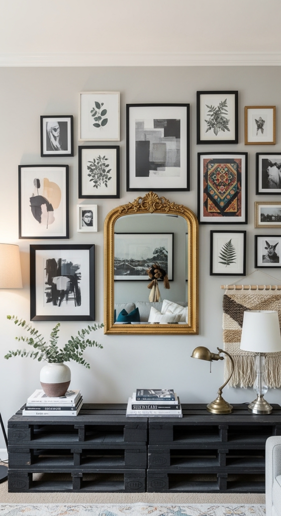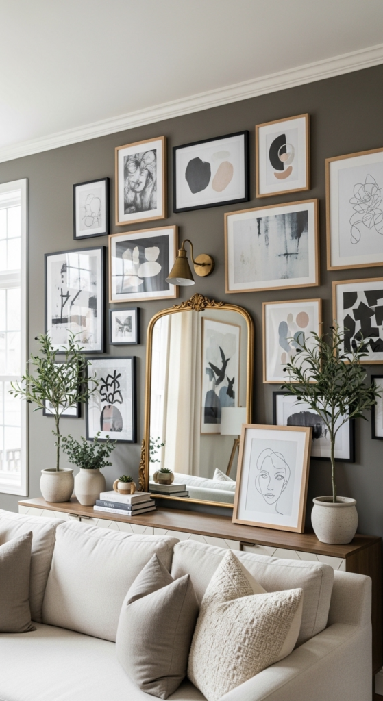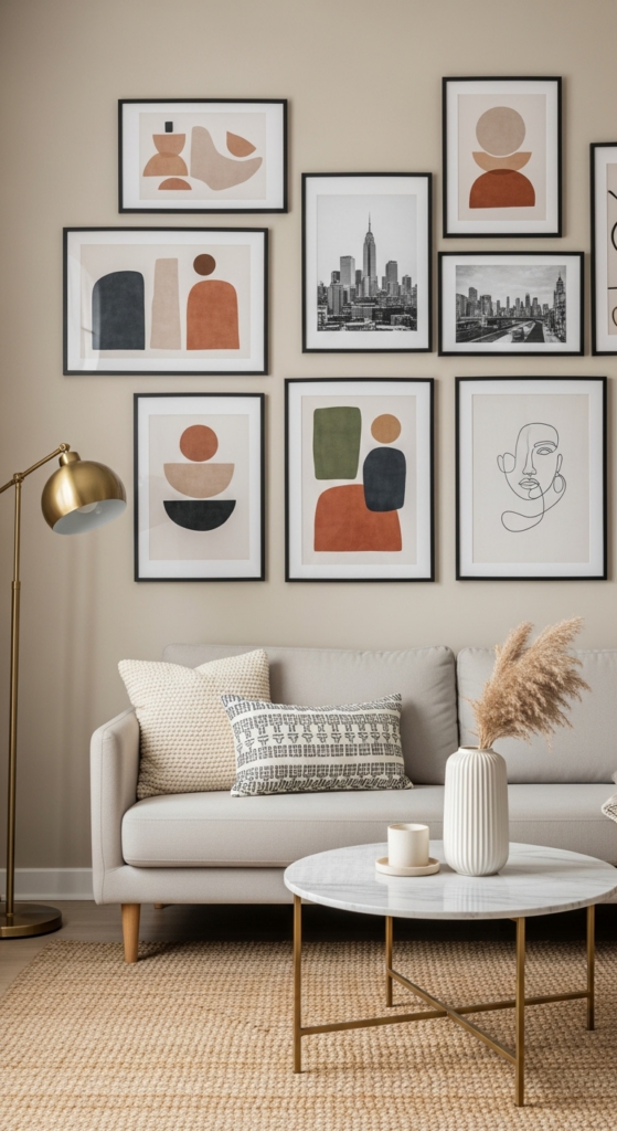 You don’t need expensive frames—thrift stores and budget shops work perfectly. Keep a consistent color palette so everything looks cohesive, even if the pieces are different.