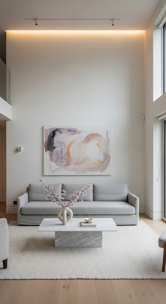 You don’t need to fill every wall. A single large artwork or a small, curated gallery wall is enough to create visual interest.