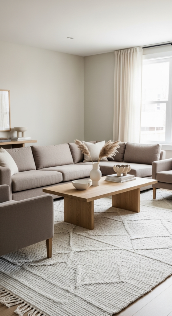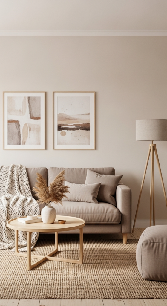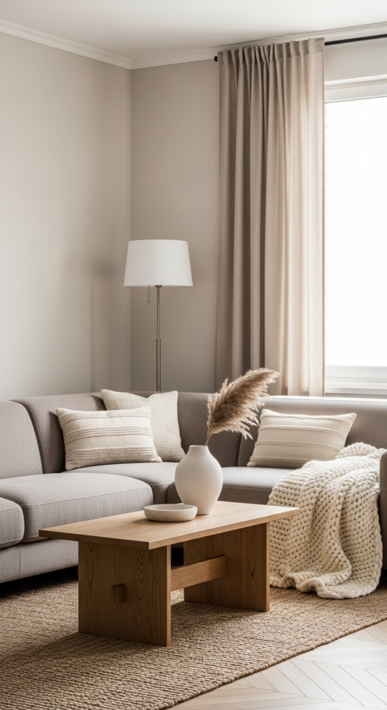 Choose soft neutrals like white, beige, gray, or warm taupe. These tones make your living room feel open, airy, and instantly more expensive.