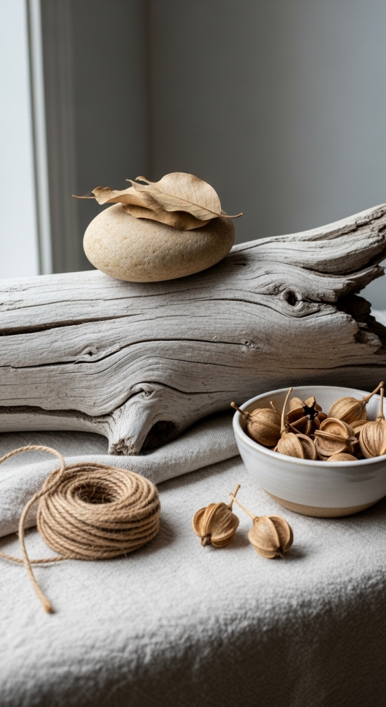 Wood, stone, and greenery add life to your living room while keeping the overall look calm and grounded.