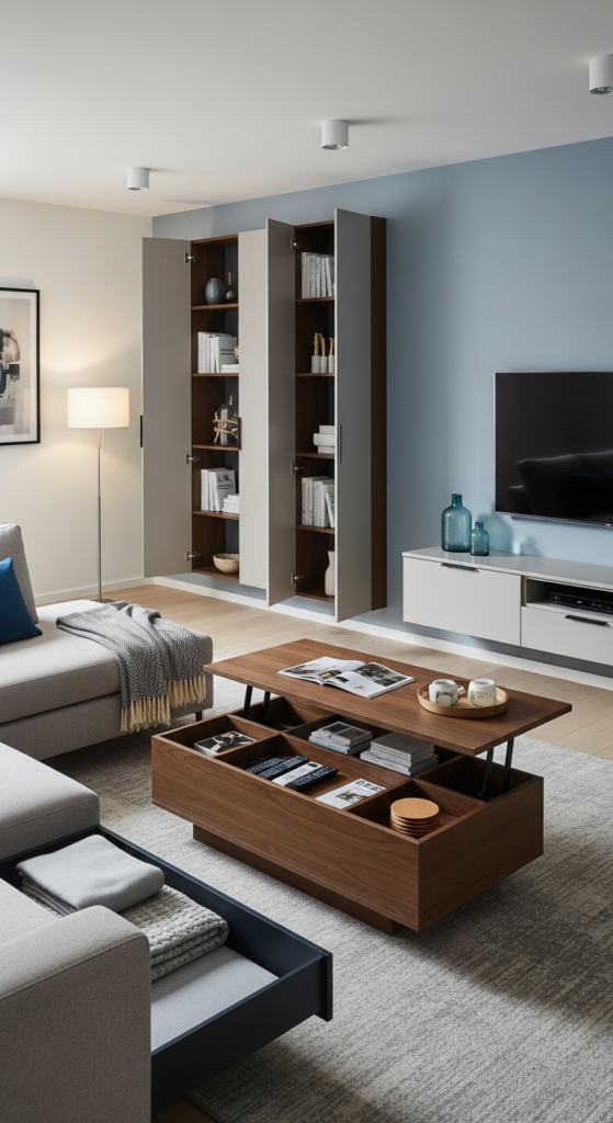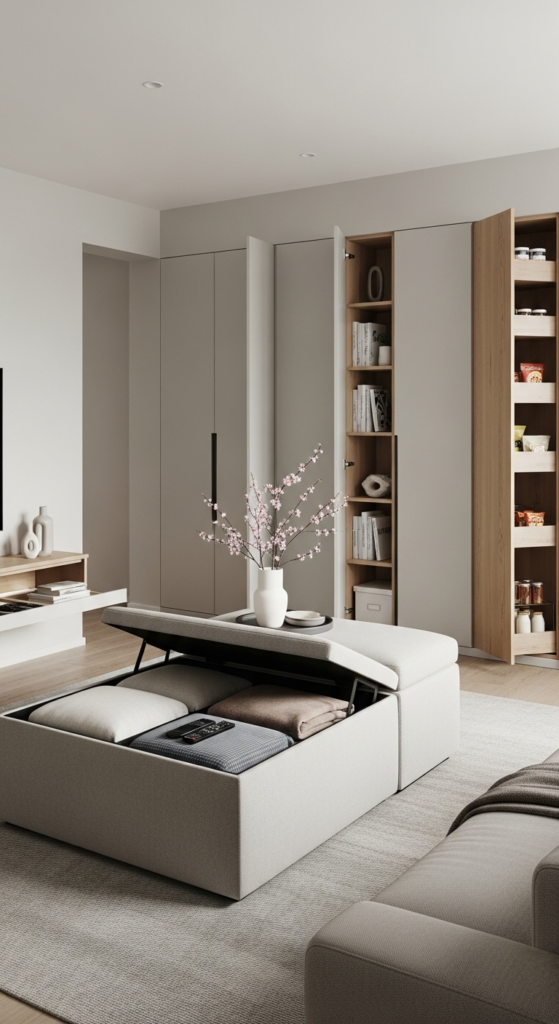 Use storage baskets, ottomans with compartments, or cabinets to keep things out of sight. This helps your living room stay clean without feeling empty.